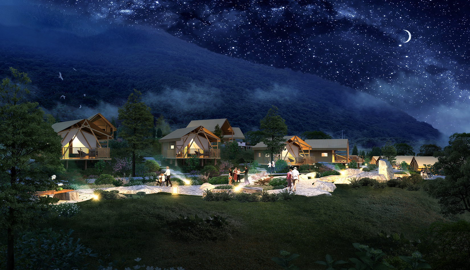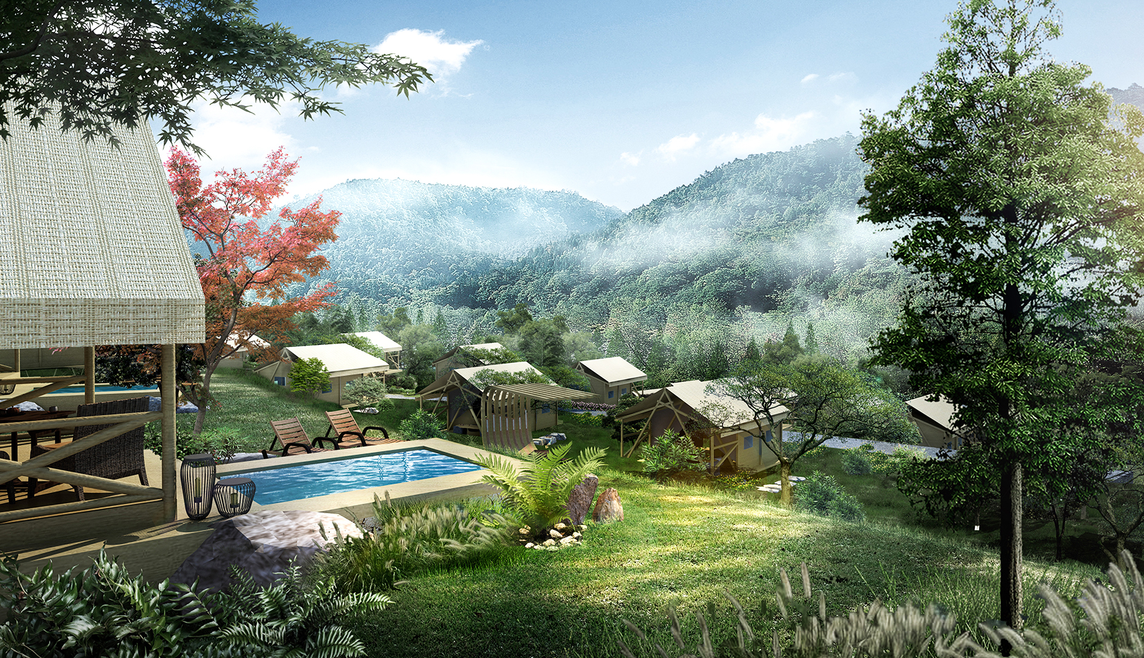 景觀設(shè)計(jì)從野奢度假酒店的“野”和“奢”兩字入手,融入荒野生態(tài)的設(shè)計(jì)理念,又要與場地相融合、與原生態(tài)相映、與當(dāng)?shù)氐拿袼罪L(fēng)情相交匯,突出當(dāng)?shù)氐奈幕黝},強(qiáng)調(diào)高品質(zhì)的自然、野奢度假,從而打造出一個(gè)具備個(gè)性與特色,使游客能夠享受到自然野趣體驗(yàn)的景觀環(huán)境。