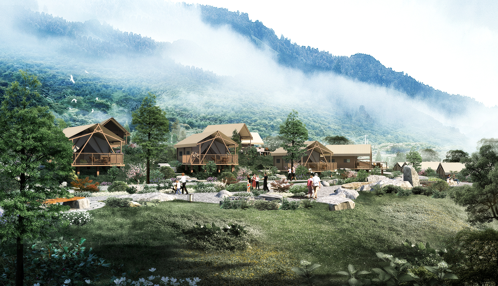 根據(jù)基地的地勢分布及功能需求,空間結(jié)構(gòu)上分為“一帶兩軸三核心五組團(tuán)”。建筑設(shè)計(jì)的五個(gè)組團(tuán),分別是濱水休閑組團(tuán)、水畔風(fēng)光帳篷組團(tuán)、高端養(yǎng)心帳篷組團(tuán)、中心服務(wù)組團(tuán)及山居野趣帳篷組團(tuán)。客房部分采用帳篷度假屋的方式,凸顯野奢度假的浪漫形式。