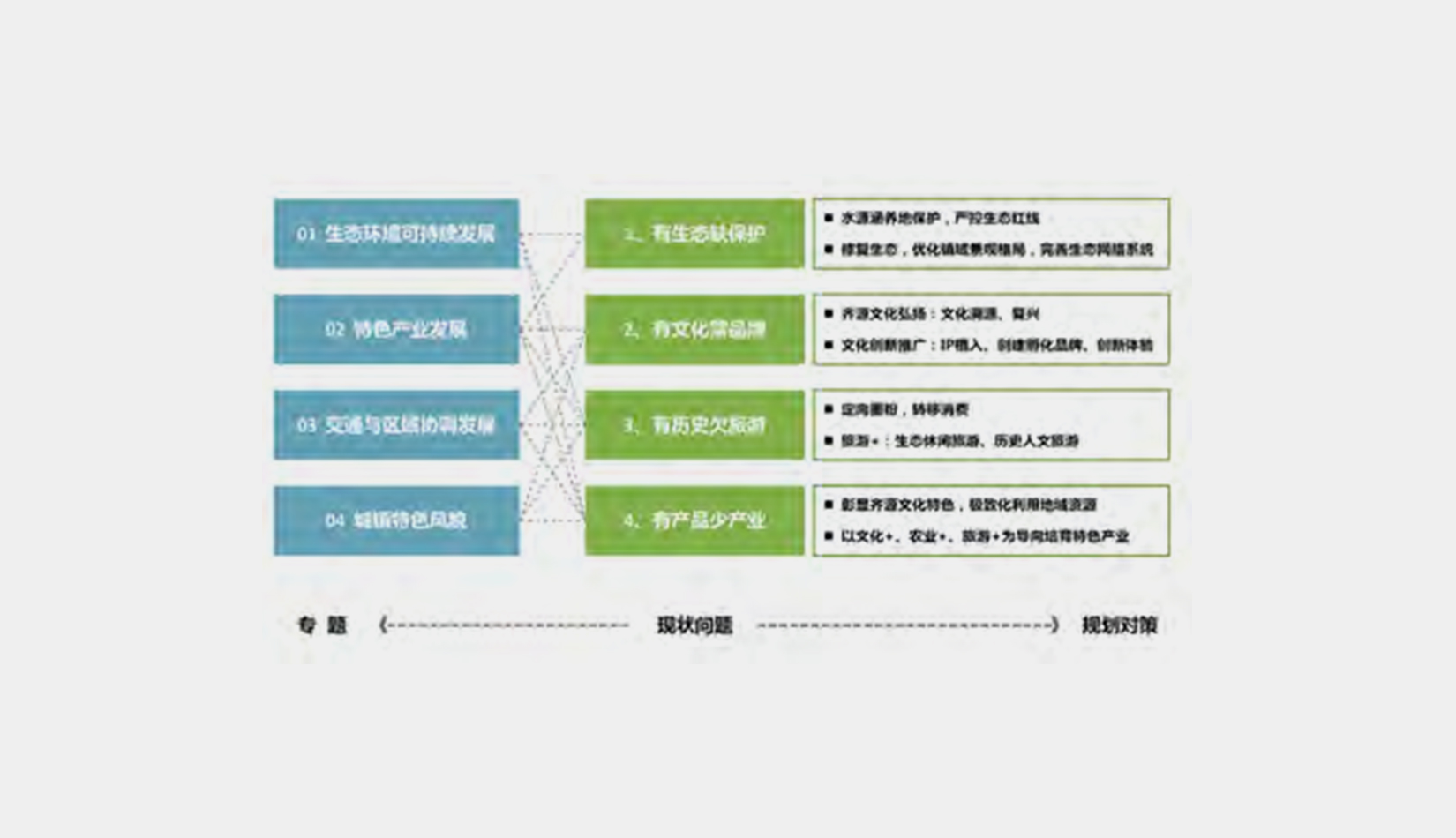 發(fā)展策略: 生態(tài)環(huán)境可持續(xù)發(fā)展、齊源文化復(fù)興、基礎(chǔ)產(chǎn)業(yè)提升、基礎(chǔ)設(shè)施完善、公共服務(wù)提質(zhì)特色產(chǎn)業(yè)體系: 凸顯營丘齊源文化特色,轉(zhuǎn)化、極致化利用地域特色資源,以”文化+“、”農(nóng)業(yè)+“、”旅游+”為特色產(chǎn)業(yè)培育導(dǎo)向,完善、提升產(chǎn)業(yè)鏈價值鏈,構(gòu)建一個特色鮮明、主題明確的特色產(chǎn)業(yè)體系。